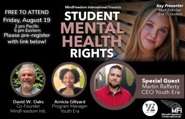 All welcome to pre-register! Happy Mad Pride Month! You are invited to a free, public webinar on Zoom about MindFreedom International’s (MFI) Support Coalition: THIS Monday, 25 July 2022 12:30 pm Pacific 1:30 pm Mountain 2:30 pm Central 3:30 pm Eastern 8:30 pm UK 9:30 pm CET (19:30 GMT, or find your local time here)…