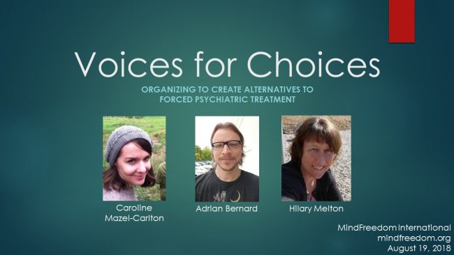 Since many mental health ‘experts’ are calling for the government to expand forced drugging and shock, our need to organize has never been more important! With generous support from the Foundation for Excellence in Mental Health Care, MindFreedom International is hosting a webinar entitled: “Voices for Choices: Organizing for Alternatives to Forced Psychiatric Treatment”. “Voices…